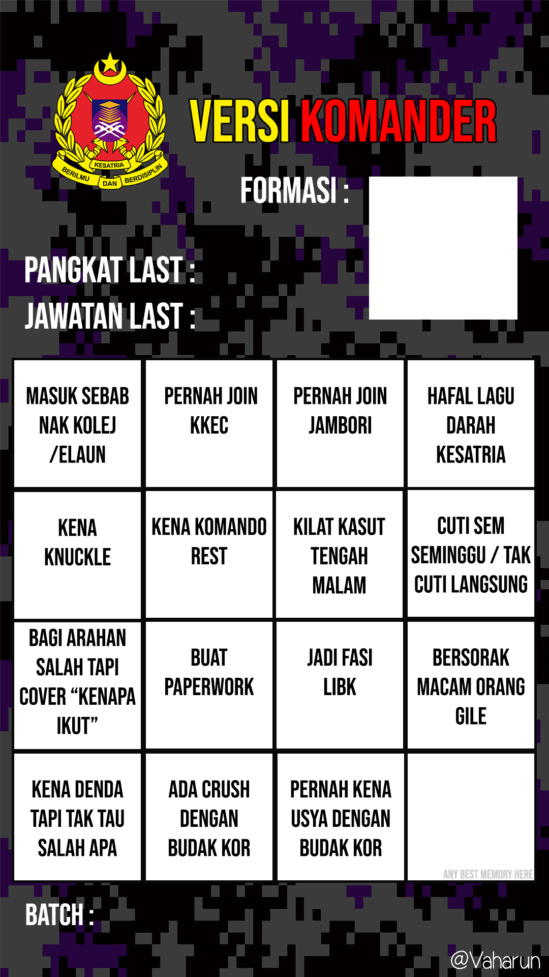 Corak templat Bingo Instagram/WhatsApp ini direka sebagai saja-saja untuk Komander Kesatria Universiti Teknologi MARA terutamanya para alumni bagi mengimbau kenangan dan berkongsi pengalaman mereka sewaktu berkhidmat.